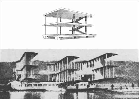 Le Corbusier: Maison Dom-ino (1914) e una fotografia dell'Idrocellulare Caproni tratta da "Verso un'Architettura" (p.89)