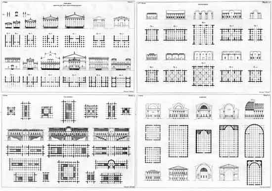 Jean Nicolas Durand, le parti (1802-1805, Precis des lecons d'Architecture, parte II, tav.8, 10, 11, 12)