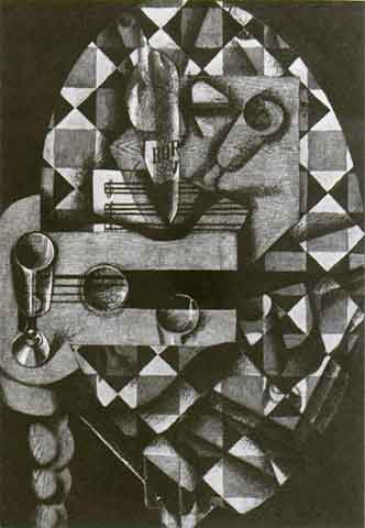 Juan Gris, Chitarra, bicchieri e bottiglia, 1914