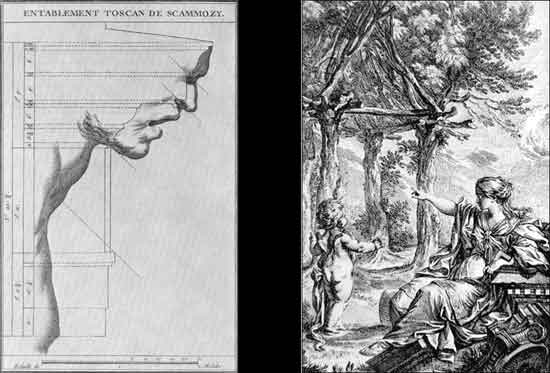 La capanna archetipa di Laugier in un'incisione del settecento >